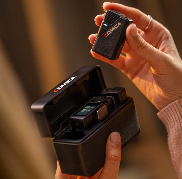 The Comica BooMax microphones are the best in audio. 32-bit float internal recording at just a little bit over half the price of a similar type. You’re in the 32-bit float audio in action right now. Each transmitter has 32GB of internal storage. That’s over four times the storage capacity of a competitor. This means you can capture more and wear it less without running out of space. You can start /stop recording, monitor your audio levels, or adjust the gain levels directly from the receiver. Utilizing the intuitive touchscreen, or you can connect via Bluetooth to the Comica Audio App, which is available on Android and iPhone, and control both transmitters from the App. Each transmitter has over 10 hours battery life, which doubles to 20 with the rechargeable case.