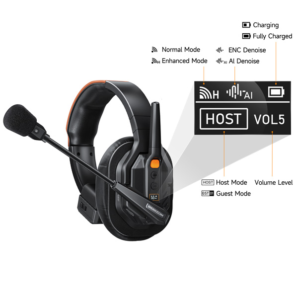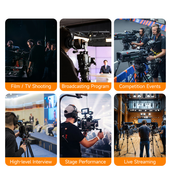 The integrated headset supports up to 12 hours of wireless duration, making it ideal for long-term filming and performance management. With a single charge, it can work for a whole day.